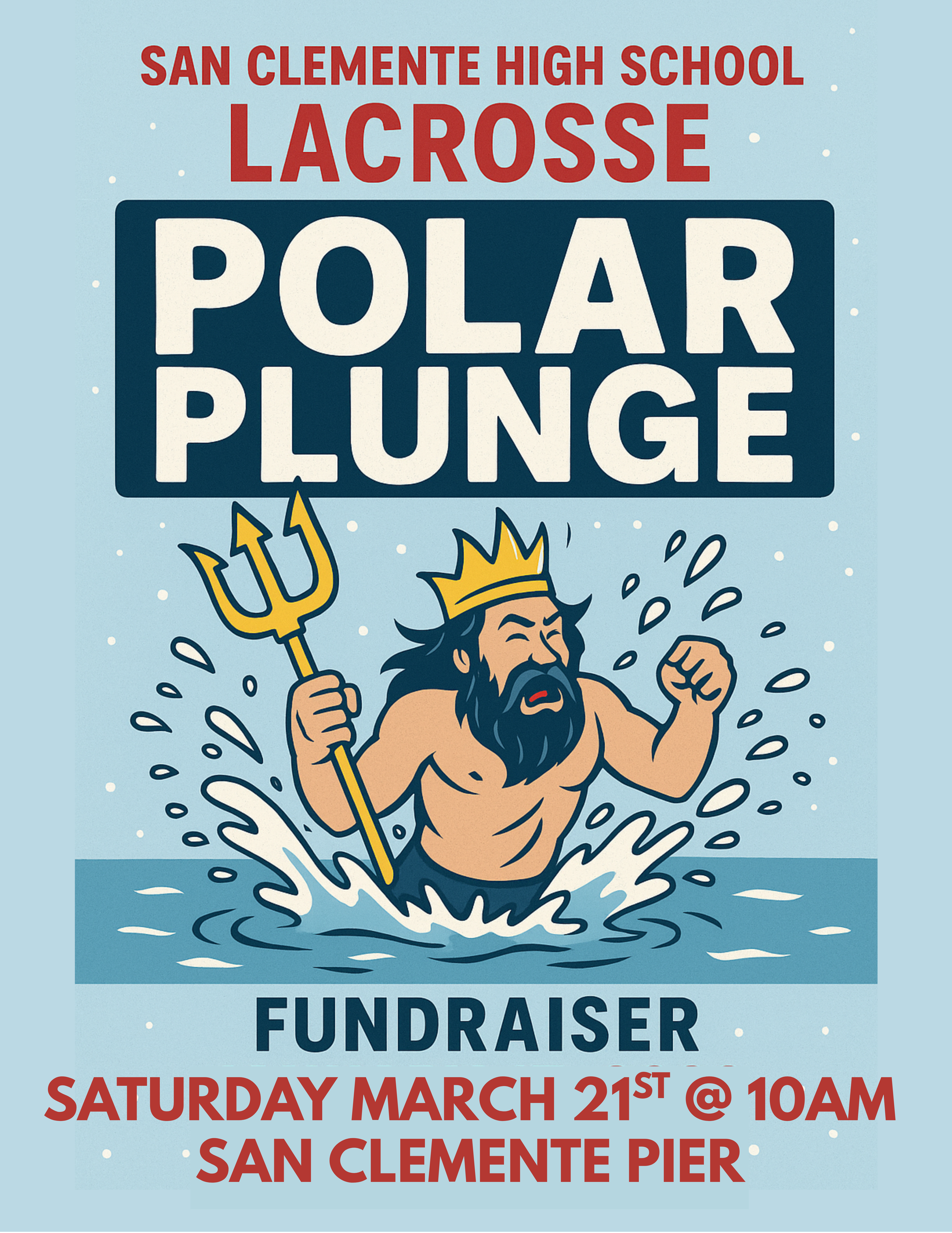 POLAR PLUNGE Saturday, March 21, 2026 10:00 AM 12:00 PM San Clemente Pier (map) Google Calendar ICS Support the SCHS Boys Lacrosse Team as players take the plunge into the Pacific to raise funds for the program. Every donation directly supports the continued growth of the SCHS Boys Lacrosse program.SAN CLEMENTE PIER - 10AM DONATION DETAILS